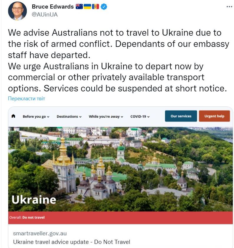 "Ми рекомендуємо австралійцям не їздити до України через ризик збройного конфлікту. Члени сімей співробітників нашого посольства поїхали. Ми закликаємо австралійців, які перебувають в Україні, виїжджати наразі на комерційному або іншому приватному транспорті. Авіаперельоти можуть бути призупинені в найкоротший термін", - написав Едвардс.