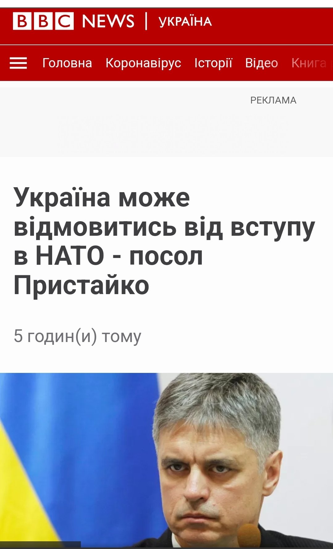Раніше посол України у Великій Британії Вадим Пристайко заявив, що Україна може відмовитись від вступу до НАТО, щоб уникнути війни з Росією. У МЗС України заявили, що слова Пристайка про можливу відмову України від членства в НАТО вирвані з контексту. Прессекретар Зеленського Никифоров з цього приводу заявив, що вступ до НАТО, як і європейський курс, є безумовним пріоритетом України.