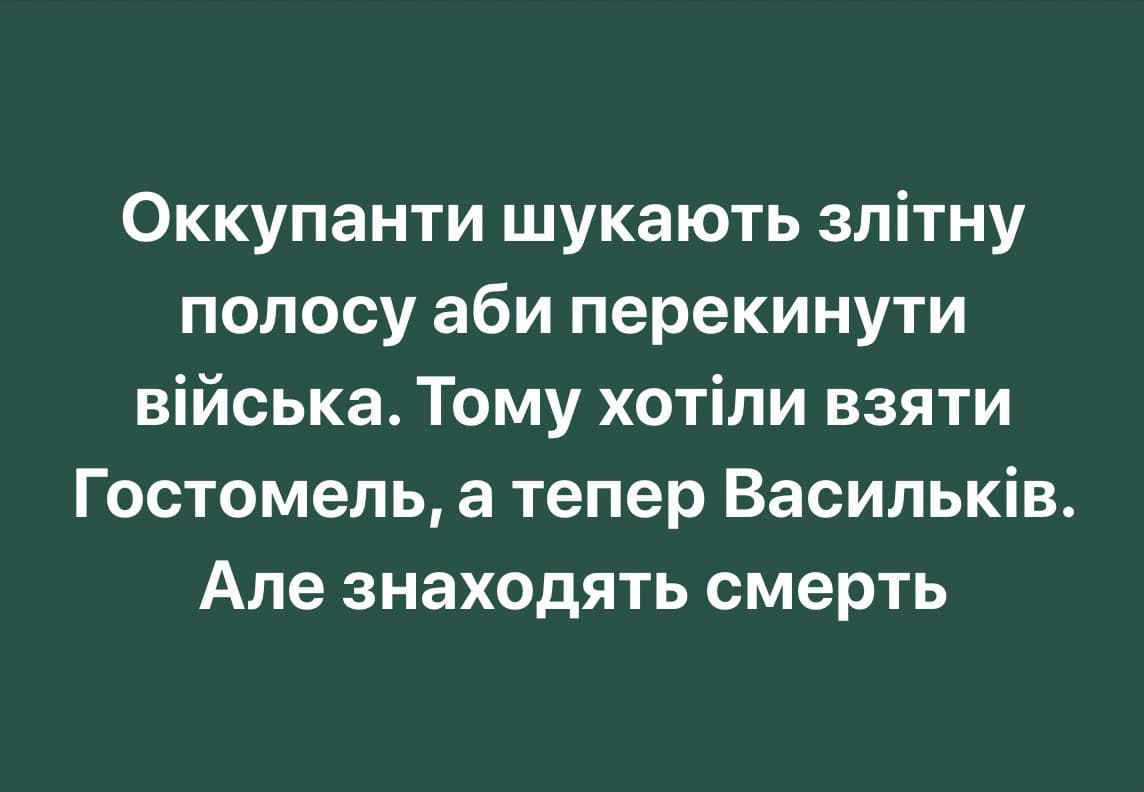 За її словами, територіальна оборона спільно з військовими 40-ї бригади втримали місто. На допомогу Василькову з Києва оперативно направили велику кількість техніки.