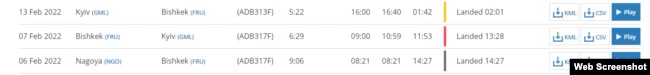 Ще один "Руслан" з бортовим номером UR-82008 вилетів з аеропорту Гостомеля 13 лютого і того ж дня приземлився в аеропорту столиці Киргизстану Бішкек.