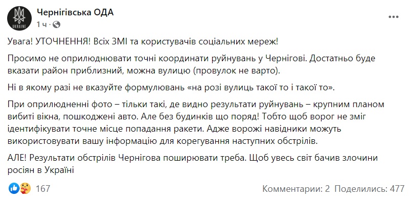 "Просимо не оприлюднювати точні координати руйнувань у Чернігові. Достатньо буде вказати район приблизний, можна вулицю (провулок не варто). Ні в якому разі не вказуйте формулювань "на розі вулиць такої то і такої то".