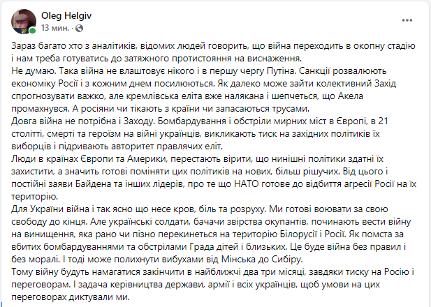 "І після цієї спроби, вона буде набагато легше, ніж була, тоді настане час позиційної війни. В обороні вони стануть, ми будемо знати, де вони і добити їх ракетними ударами, партизанами, ССО, силами місцевого населення буде набагато краще. Для нас вигідніше наступна фаза і тоді вони підуть на справжні переговори, а не безглузді ультиматуми", - заявив він.