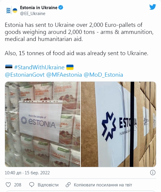 "Естонія відправила в Україну понад 2000 європіддонів із товарами вагою близько 2000 тонн – зброєю та боєприпасами, медичною та гуманітарною допомогою.