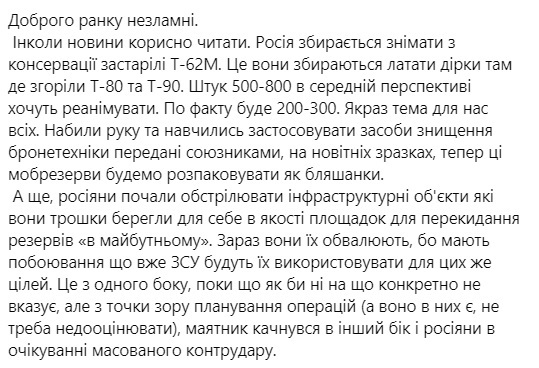 На даний час плани з передачі на фронт техніки, знятої зі зберігання фактично зірвано. За наявної інформації - командир 13 танкового полку 4 танкової дивізії РФ - застрелився. Джерело: