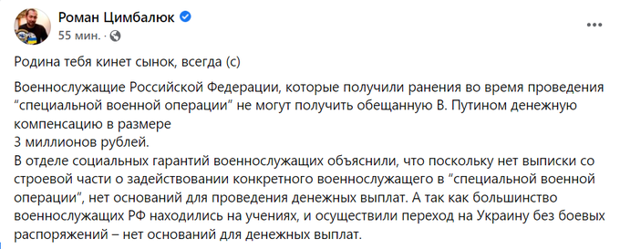 "Для деяких російських окупантів "військові навчання" на території України скінчились достроково. У мо рф розпочато процедури нагородження причетних до російсько-української війни "сертифікатами" державного зразка. Далі буде...", - йдеться в повідомленні.