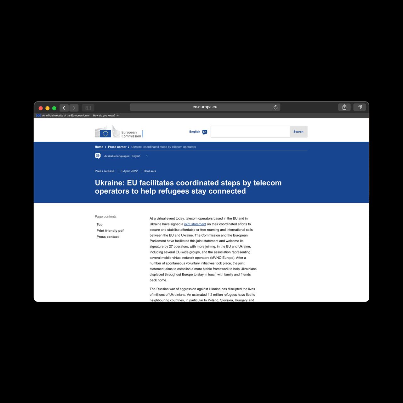 24 мобільні оператори ЄС та 3 мобільні оператори України підписали спільну заяву щодо координації зусиль для забезпечення доступного та безоплатного роумінгу під час міжнародних дзвінків ЄС-Україна.