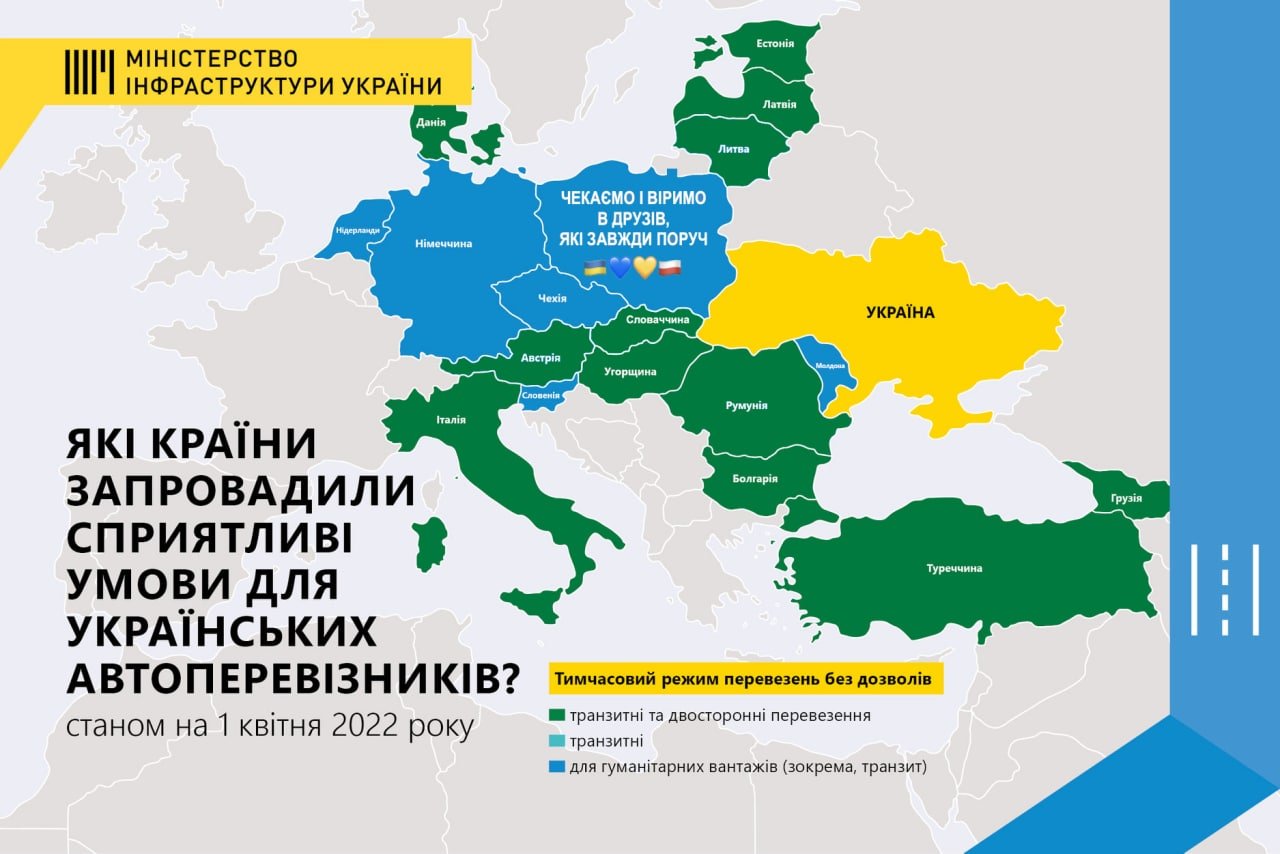 Нині низка країн спростила свої вимоги для українських перевізників. Зокрема, всі дозвільні документи для перевізників з України вже скасували Австрія, Словаччина, Румунія, Туреччина, Естонія, Латвія, Литва, Грузія, Болгарія, Угорщина, Італія, Данія.