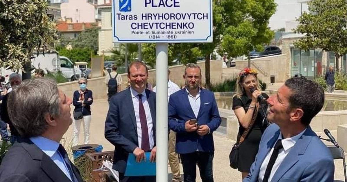 Урочиста церемонія перейменування затишної канської площі на честь українського поета Тараса Шевченка відбулась за участі посла України у Франції Вадима Омельченка та мера міста Канни, президента Асоціації мерів міст Франції Давіда Лізнара, а також у присутності активістів франко-українських асоціацій, місцевих політичних і громадських діячів та українських родин, які знайшли прихисток у Каннах та околицях.