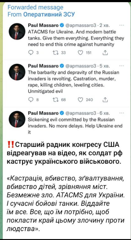 "А вы перейдите в Твиттер, посмотрите ветку. Там есть видео, где голова и кисти украинского солдата висят на заборе, а тело лежит рядом. ***** ребятки у вас там выродки водятся... Я просто в ****."