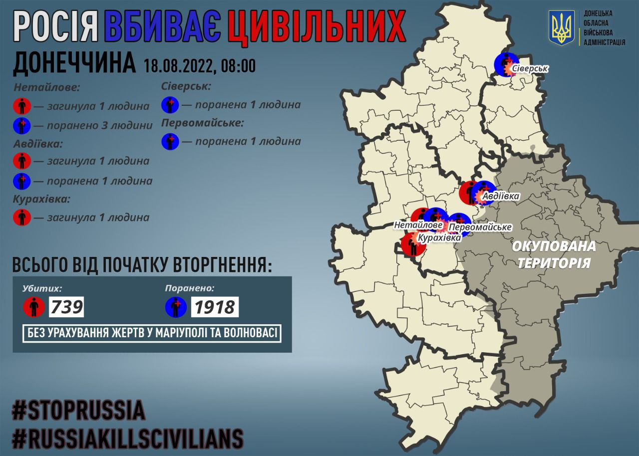 "За 17 серпня росіяни вбили 3 мирних жителів Донеччини: в Авдіївці, Нетайловому та Курахівці. Ще 6 людей отримали поранення", - йдеться у повідомленні.