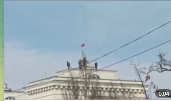 І ще одне, третє, коротеньке відео, дуже сумне, але вже з ранку 24 лютого. Тут рашисти, які без жодних перешкод доїхали до Нової Каховки. Вони знали, що перешкод, мін, військ там не буде. Як їм пообіцяли, так усе й було виконано. Ці кадри зняті в 11.00. Наволоч вішає на адмінбудівлі свою триколірну шмату. Але прибули вони в центр Нової Каховки й висадилися з автомобілів перед міськрадою ще до 9.00 ранку.