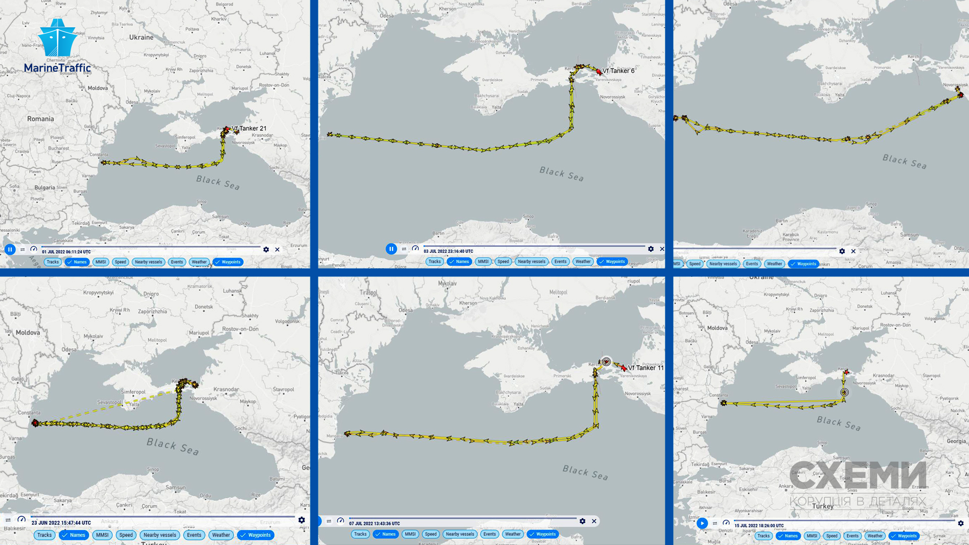 Журналіст "Схем" довго спостерігав за моніторинговим сервісом Marine Traffic, фіксуючи такі приклади системного обходу обмеження ЄС компанією Лісіна.