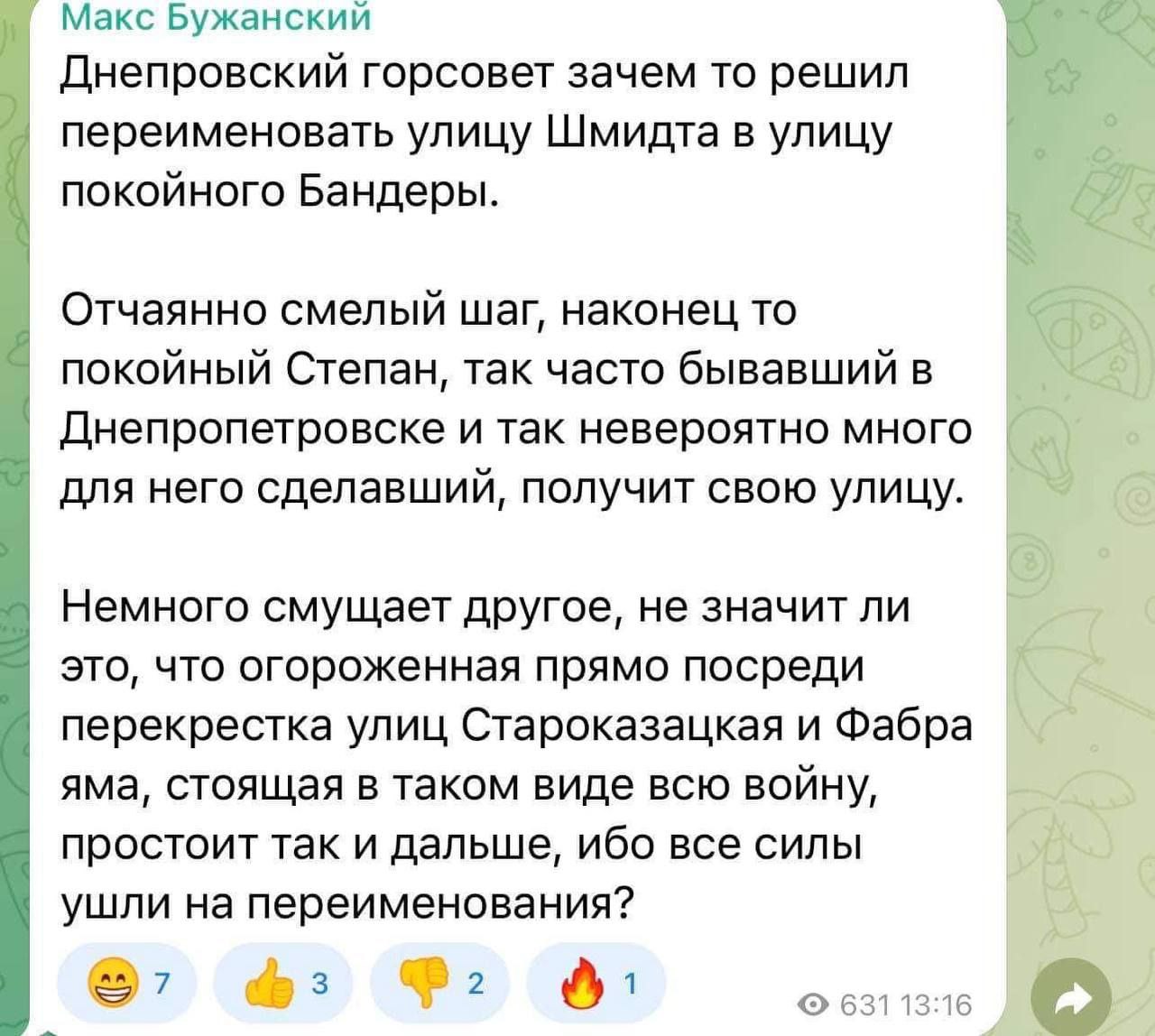 Пишаюсь за Дніпро, коли вже в Харкові буде вулиця Бандери Тєрєхов (замість вулиці пушкіна)