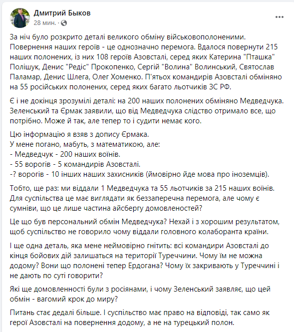 Ми віддали генерала Cичового у т.ч. а також пілотів що бомбили українські міста? Вважаю, таки люди, відповідальні за загибель тисяч українців та удари по цивільній інфраструктурі не підлягають обміну ні за яких обставин щонайменше до кінця війни.