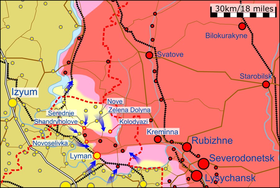 Крім того, американський інститут повідомляє, посилаючись на російські джерела, що українська артилерія тримає під вогневим контролем останню дорогу для постачання російських військ у місті через Сватово, Макіївку та Терни. Українські розвідувальні та диверсійні групи вже помічені у містах Торське та Ямпіль на південний схід від Лиману.
