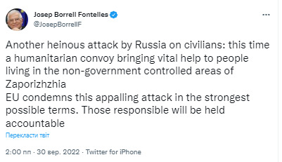 Глава дипломатії Євросоюзу Жозеп Боррель заявив, що ЄС рішуче засуджує удар по автоколонні в Запорізькій області, назвавши його "жахливим нападом".