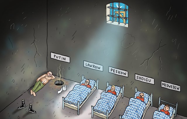 "З одного боку, все це виглядає знайомим, оскільки Путін вдався до подібної процедури у 2014 році під час анексії Криму (неприкрите використання сили, насильницький "референдум", за якими йшла грандіозна церемонія з приводу "завершення справи"). З іншого, події минулого тижня сприймаються по-іншому. Путін зараз постав перед поразкою на полі бою, посиленням опозиції вдома та дедалі більшою ізоляцією за кордоном. Його промова та представлений ним стиль мислення були майже сюрреалістичним коктейлем дикунських погроз, конспірологічних думок, та фантазійних образ. Це дозволяє припускати, що цей чоловік є настільки ізольованим, що він потонув у почутті "жертви" та втратив дотик до реальності", - пояснив він.