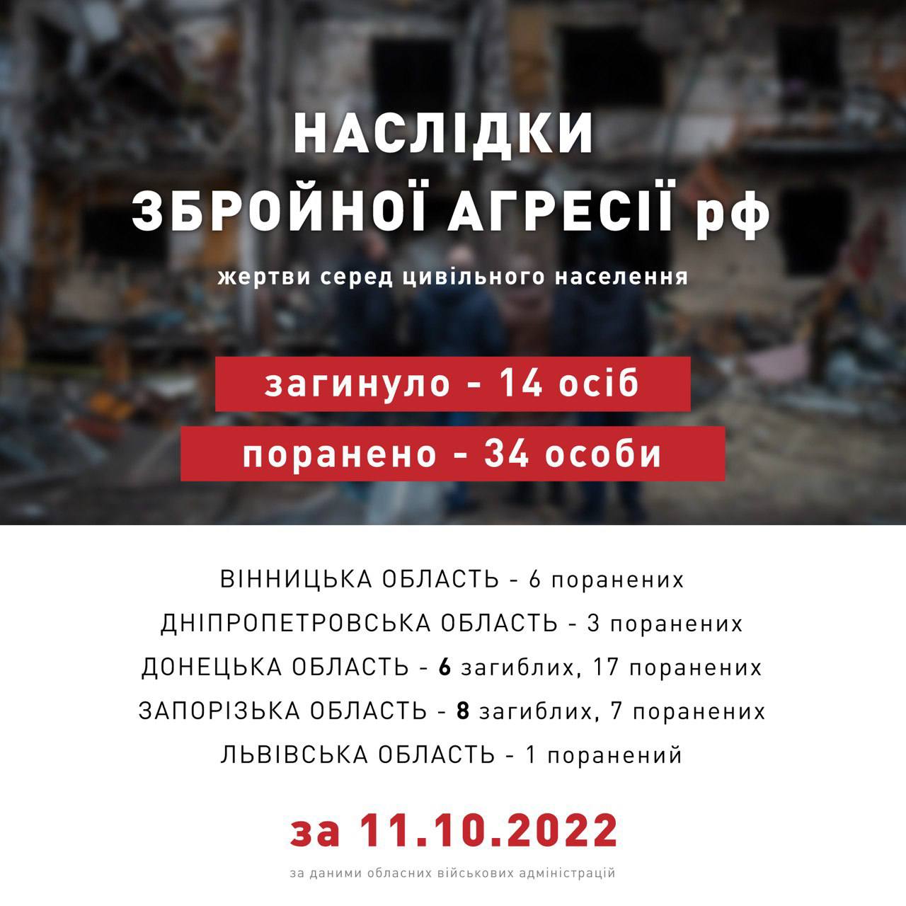 Унаслідок російської агресії упродовж минулої доби, 11 жовтня, загинуло 14 цивільних осіб, 34 людини поранено.