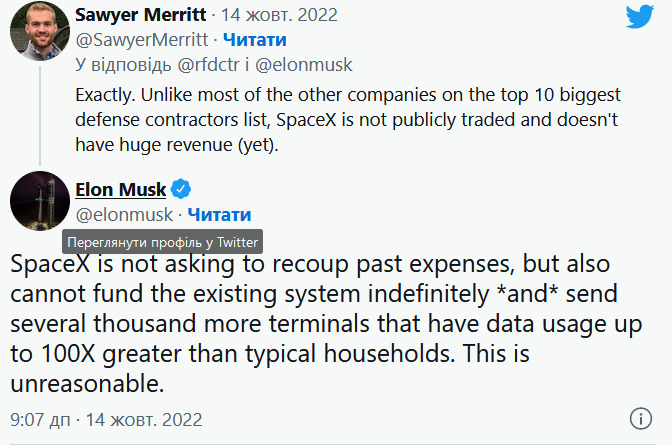 "SpaceX не просить відшкодувати минулі витрати, але також не може фінансувати існуючу систему нескінченно *і* відправити ще кілька тисяч терміналів, які використовують дані до 100 разів більше, ніж звичайні домогосподарства. Це нерозумно", - написав він.