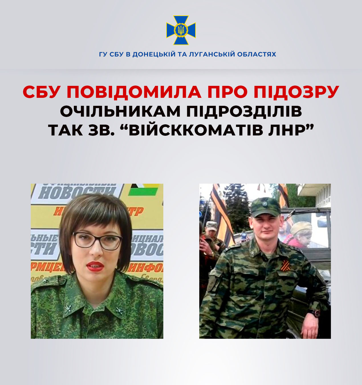Слідчі Служби безпеки України задокументували злочинну діяльність керівних "посадовців" незаконно створеного окупантами "військового комісаріату ЛНР по м. Краснодон" (тимчасово окуповане місто Сорокине) - 37-річного "начальника відділення підготовки й призову громадян на військову службу" та 39-річної очільниці відділення планування, підготовки й обліку мобілізаційних ресурсів", яка відповідає за роботу "військового облікового столу по м. Свердловськ" (тимчасово окупований Довжанськ).