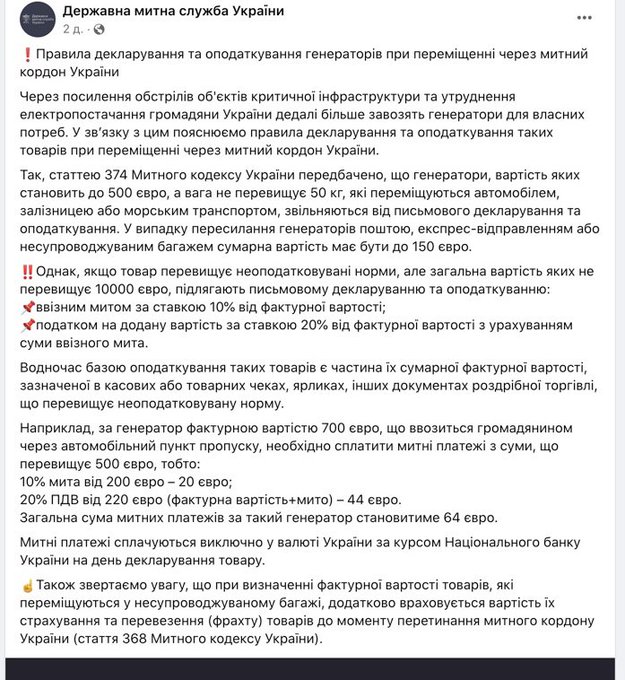 Дивна позиція влади: замість того, щоби звільнити від оподаткування генератори та супровідне електрообладнання вона «турботливо» пояснює як треба платити на них податки.