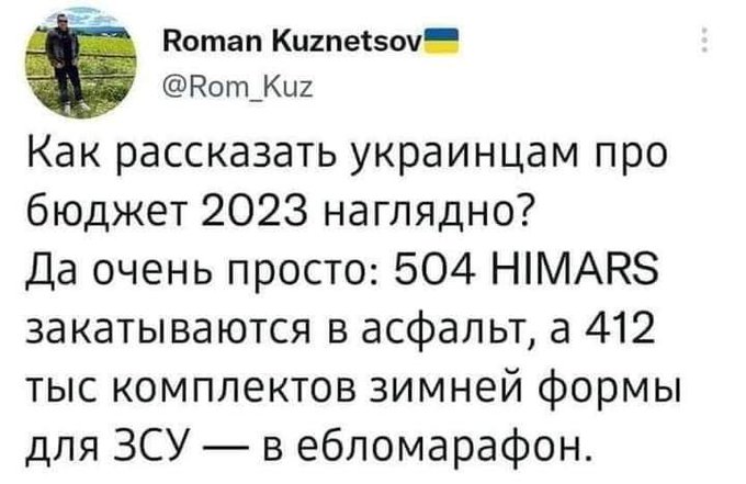 Краще б ЗЕлені ***** займалися тим, щоб ЗСУ забезпечувала Держава, а не волонтери за кошти українців.