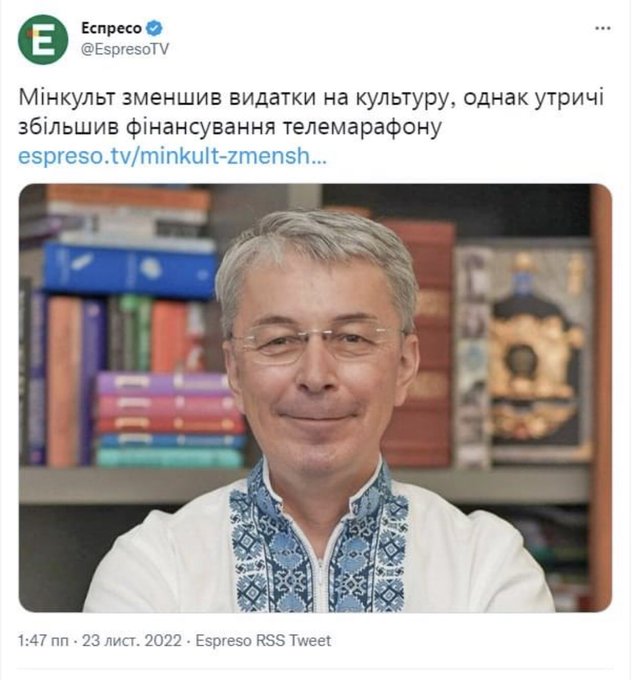 Як передає Цензор.НЕТ, про це повідомив у Telegram міністр культури та інформаційної політики Олександр Ткаченко.