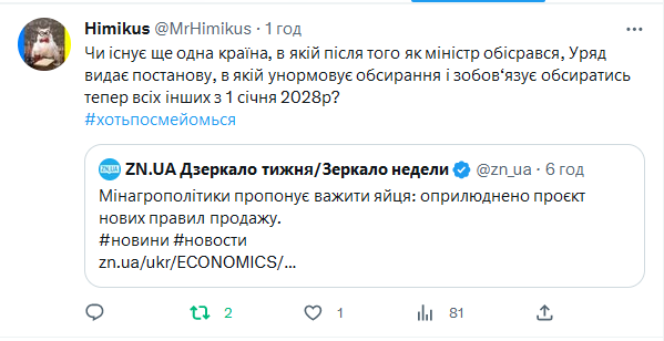 "Я готовий і далі не критикувати ініціативу, не блокувати його, не закидати правками, навіть (!!!) підтримати у першому читанні, за однієї умови….. доповідачем призначити в Парламенті нашу поважну колегу - співавтора законопроекта Мар’яну Безуглу) Тим більше, це питання національної безпеки! Впевнений, що ці 2-і хвилини варті будь-яких обмежень", - іронізує Железняк.