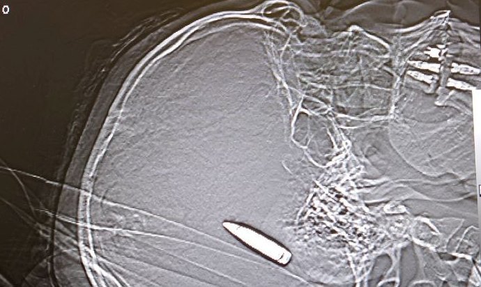 "Пуля, яка розламала праву тім'яну ділянку черепа і разом з кістковими відламками зайшла в центр мозку. Величезний крововилив в рановий канал. Четверту годину під мікроскопом усі: нейрохірурги, анестезіологи, медсестри - рятують життя 35-річного українця Олександра", - написав він.