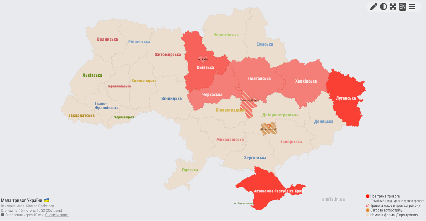 Станом на 15:30 повітряну тривогу оголошено в Києві та Київській області, а також у Черкаській, Полтавській, Харківській та Луганській областях і в Автономній Республіці Крим.