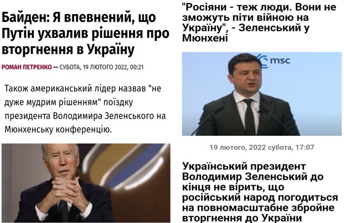 19 лютого 2022 Байден заявив, що Путін вже ухвалив рішення про напад на Україну. США були проти, щоб Зеленський був присутній на Мюнхенській конференції, бо загроза вторгнення надвелика. Зеленський все ж поїхав, щоб пізданути: "Росіяни не зможуть піти війною на Україну"