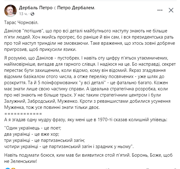 Нагадаємо, раніше Данілов заявив, що інформація про контрнаступ є закритою, нею володіють до 5 осіб. Також він зазначив, що вище військово-політичне керівництво має кілька варіантів контрнаступу.