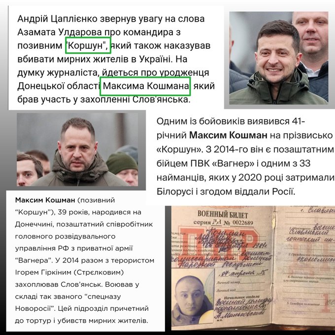 Вагнерівець Азамат Улдаров, який розказав, що вони вбивали дітей в Бахмуті і Соледарі, згадав серед командирів, що наказували виконувати злочини, Максима Кошмана (Коршуна). Він входив до групи вагнерівців, яких Зеля і Єрмак віддали путіну