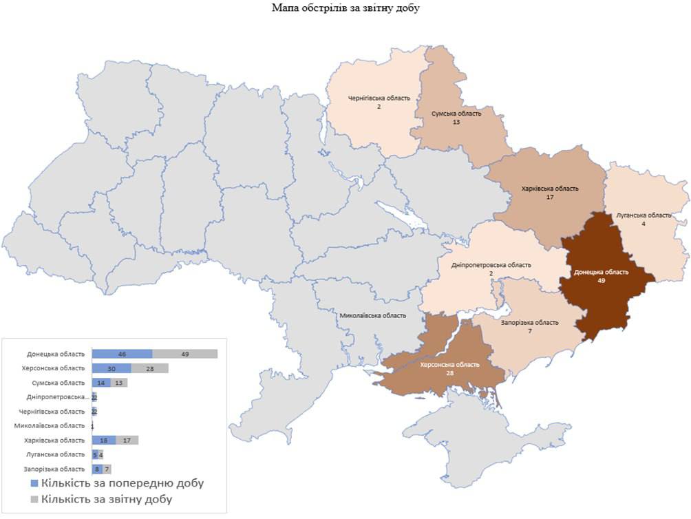 Загалом із різних видів озброєння (міномети, танки, артилерія, РСЗВ, ЗРК, БПЛА, тактична авіація) здійснено обстріли 122 населених пунктів, підтверджено ураження 102 об’єктів інфраструктури.