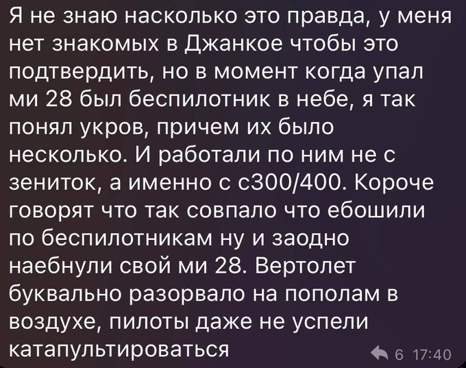 З повідомлення випливає, що гелікоптер зазнав катастрофи під час виконання "планового навчально-тренувального польоту" в Джанкойському районі Криму.