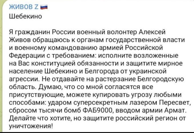 "Король виявився голим. Все боєздатне, що може рухатись, перекинуте на окупацію України. На території московщини залишились переважно пузаті "гаїшники". І цей план "Едельвейс", який оголосив Путін на території Білгородщини, скликав там так званих "силовиків", які здебільшого навчені бити кийками учасників мирних акцій протесту і брати хабарі з бабок", — сказав він.