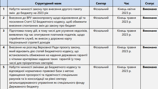 У березні 2023 року Україна отримала від МВФ нову чотирирічну кредитну програму розширеного фінансування, а на початку квітня – перший транш розміром $2,7 млрд. Ще один транш на $900 млн Рада директорів МВФ погодила наприкінці червня. Спочатку умови нової кредитної програми містили 19 структурних маяків, які Україна зобов'язалася виконати протягом найближчих 15 місяців. Після першого перегляду їхня кількість збільшилась до 23.