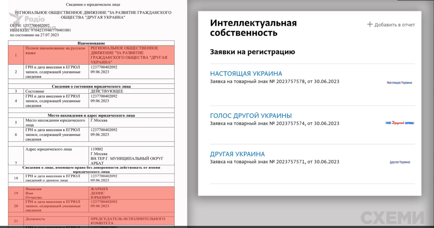 Відповідно до цих даних, у червні цього року був створений громадський рух "Региональное общественное движение "За развитие гражданского общества "Другая Украина". Адреса організації - Москва, Арбат, провулок Кемарницький, 9. Крім цього, "Другая Украина" заявила про інтелектуальну власність на товарні знаки: "Настоящая Украина", "Голос другой Украины" та "Другая Украина". Відповідно до заявлених видів діяльності, "Другая Украина" - громадська нерелігійна організація, а не політична партія, тому вона не може брати участі у виборах до місцевих рад чи до державної думи РФ. Головою виконавчого комітету організації став Денис Жарких, а головою ради руху, повідомляється на сторінці у фейсбуці "Другой Украины", є Віктор Медведчук.