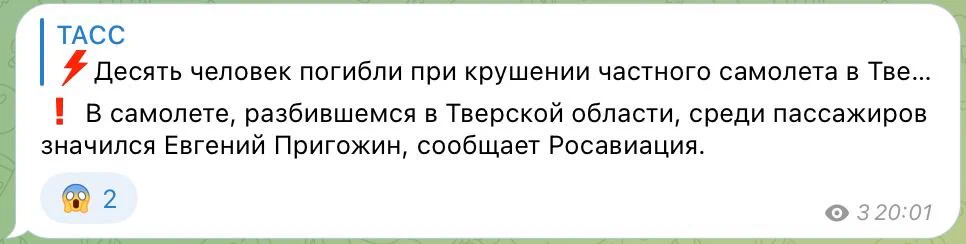 У Тверській області Росії впав літак, який належить Пригожину, - росЗМІ
