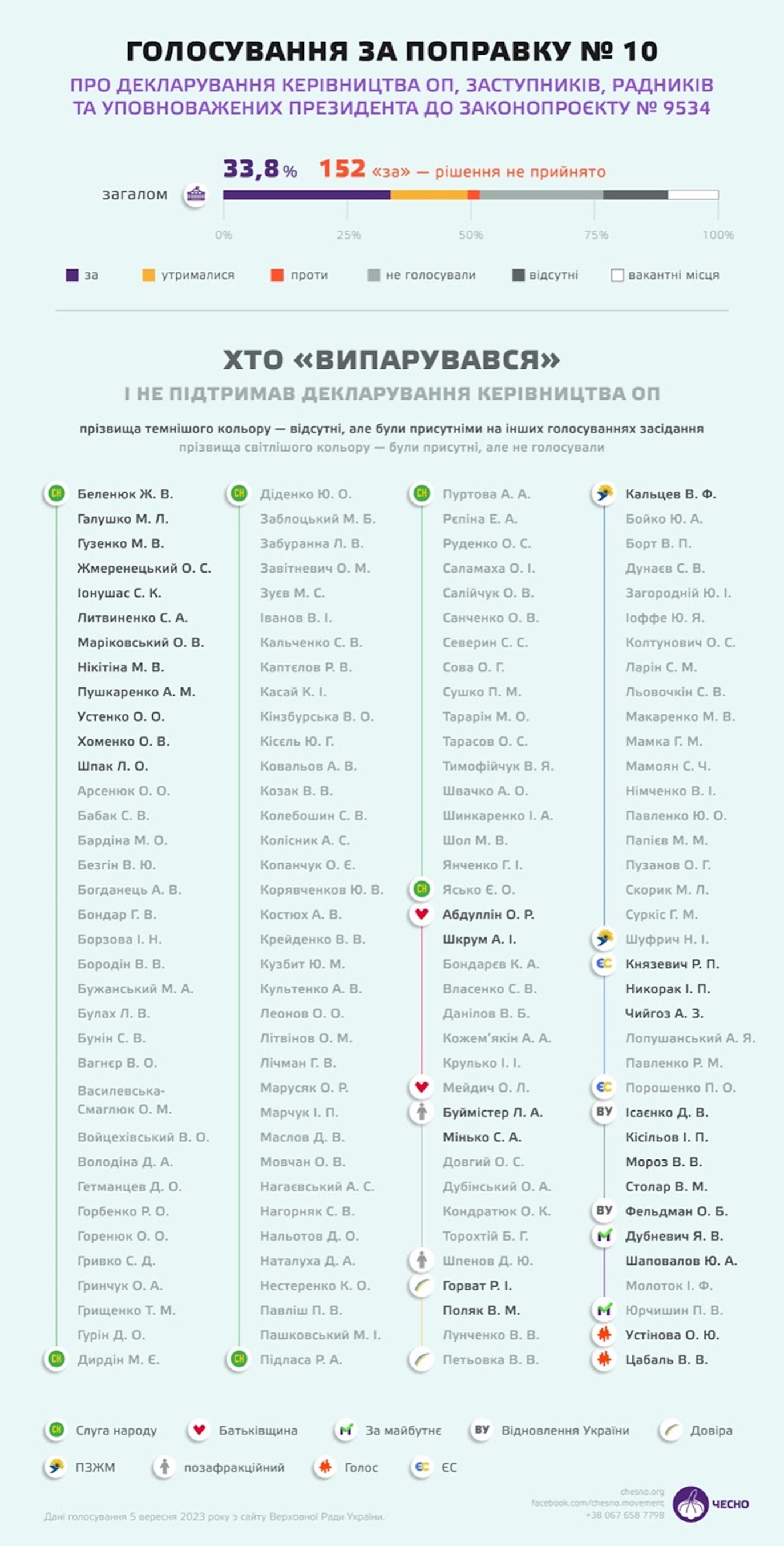 44 народних депутатів (11% від загального складу парламенту) "випарувались" і не підтримали євроінтеграційний законопроєкт про відновлення декларування в умовах воєнного стану (№9534) у другому читанні. І було вищезазначено, майже 40% представників монобільшості на чолі з головою фракції Давидом Арахамією начебто були "відсутні" або "не голосували" під час підтвердження поправки про відкриття реєстру декларацій.
