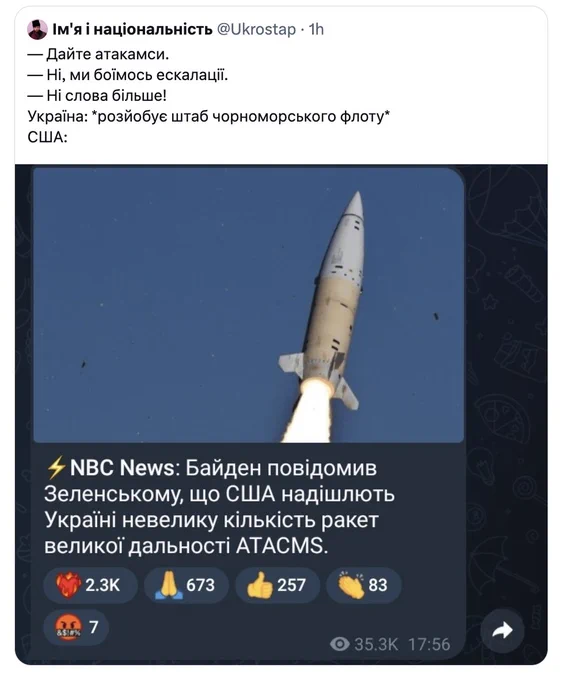 The Washington Post (WP) написала, що "адміністрація Байдена близька до того, щоб передати Києву варіант ATACMS із касетною боєголовкою, а не звичайною. Дальність її дії, зазначає видання, становить до 300 км."