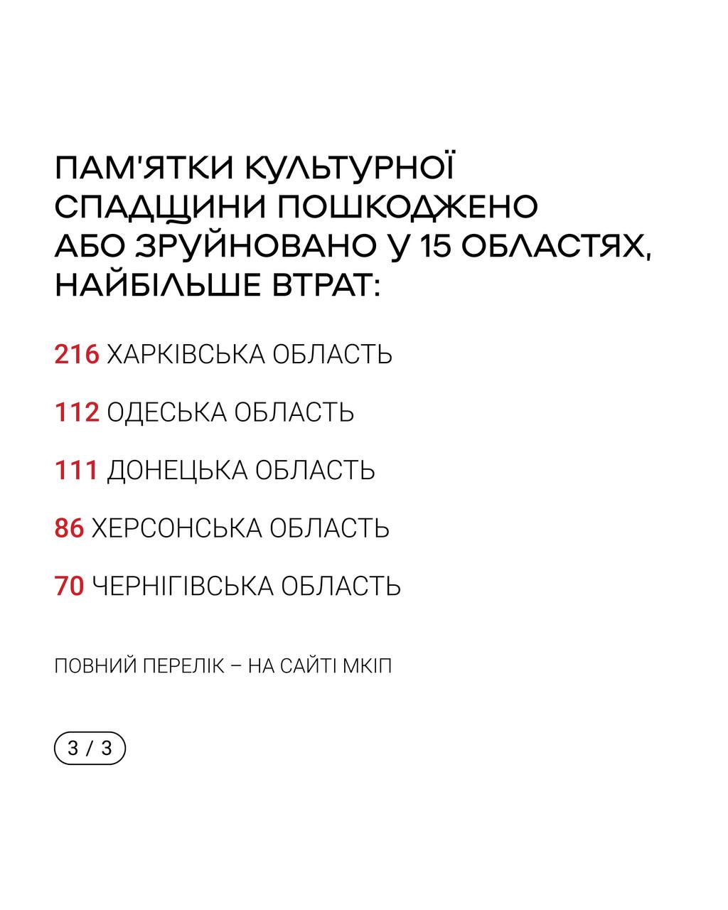 Найбільше пам'яток культурної спадщини постраждало в Харківській, Одеській та Донецькій областях.