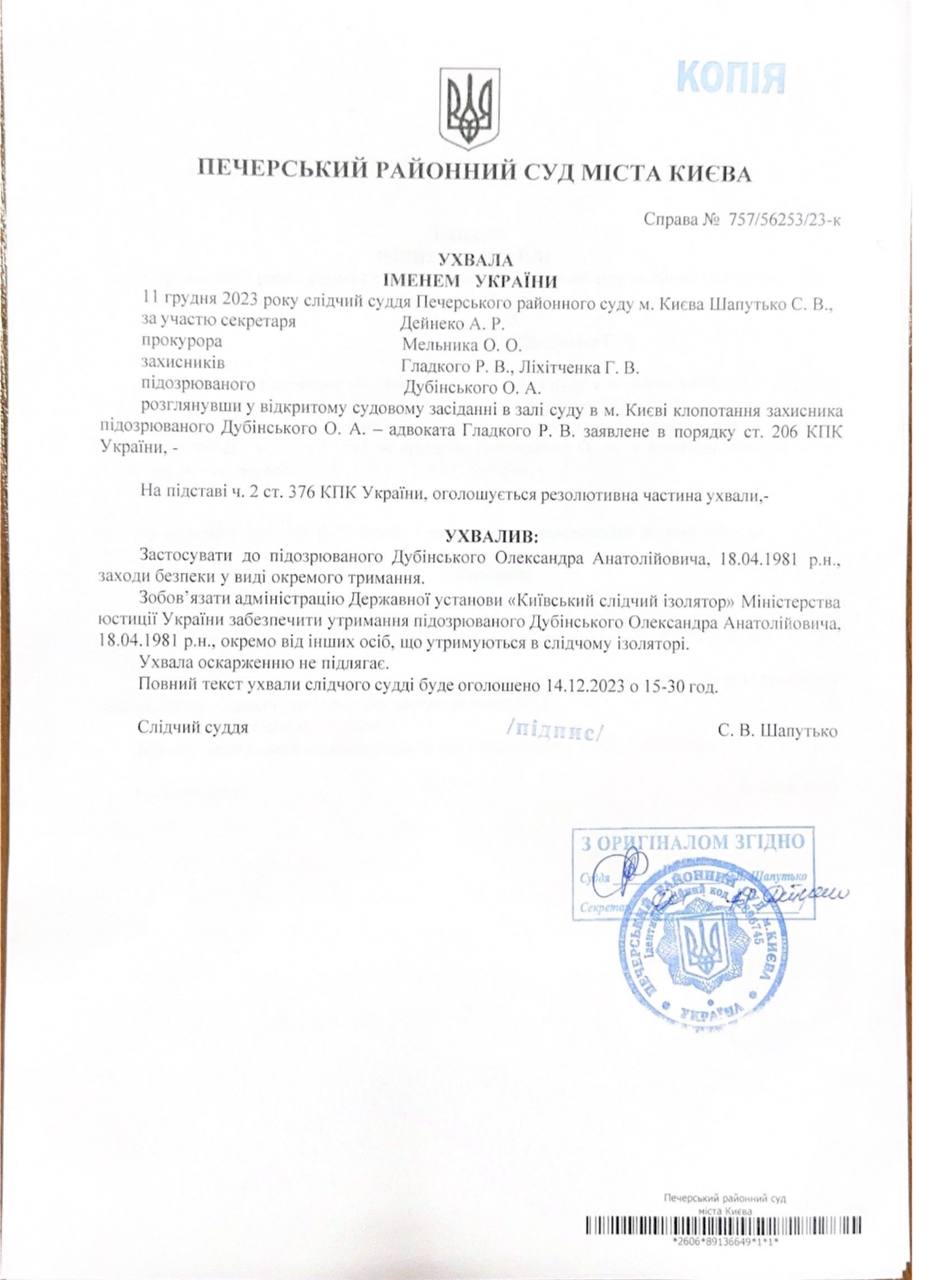 Також адвокати повідомили, що Печерський суд (суддя Шапутько) виніс рішення щодо застосування заходів безпеки щодо нардепа Дубінського, поки він перебуває у СІЗО. Його будуть утримувати в одиночній камері, окремо від інших.