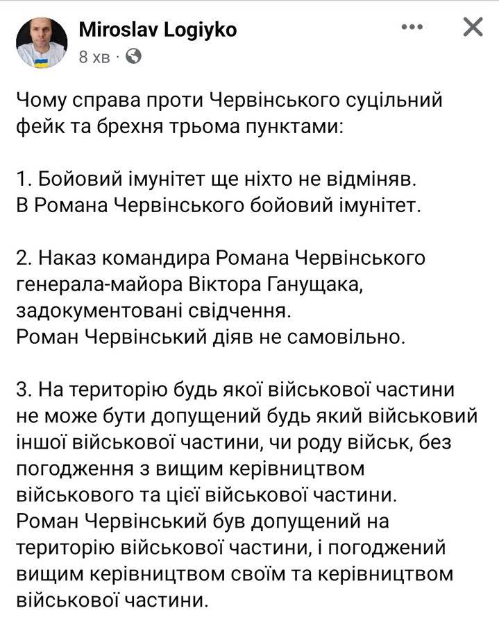 "Червінський, діючи умисно, тобто без узгодження та координації своїх дій з Головним управлінням розвідки МОН України, чи іншим розвідувальним органом, тобто явно перевищуючи надані йому як військовій службовій особі владу та службові повноваження, в період часу з липня 2022 по 22.07.22, передав вказану інформацію військовим службовим особам...", — додали в обвинуваченні.