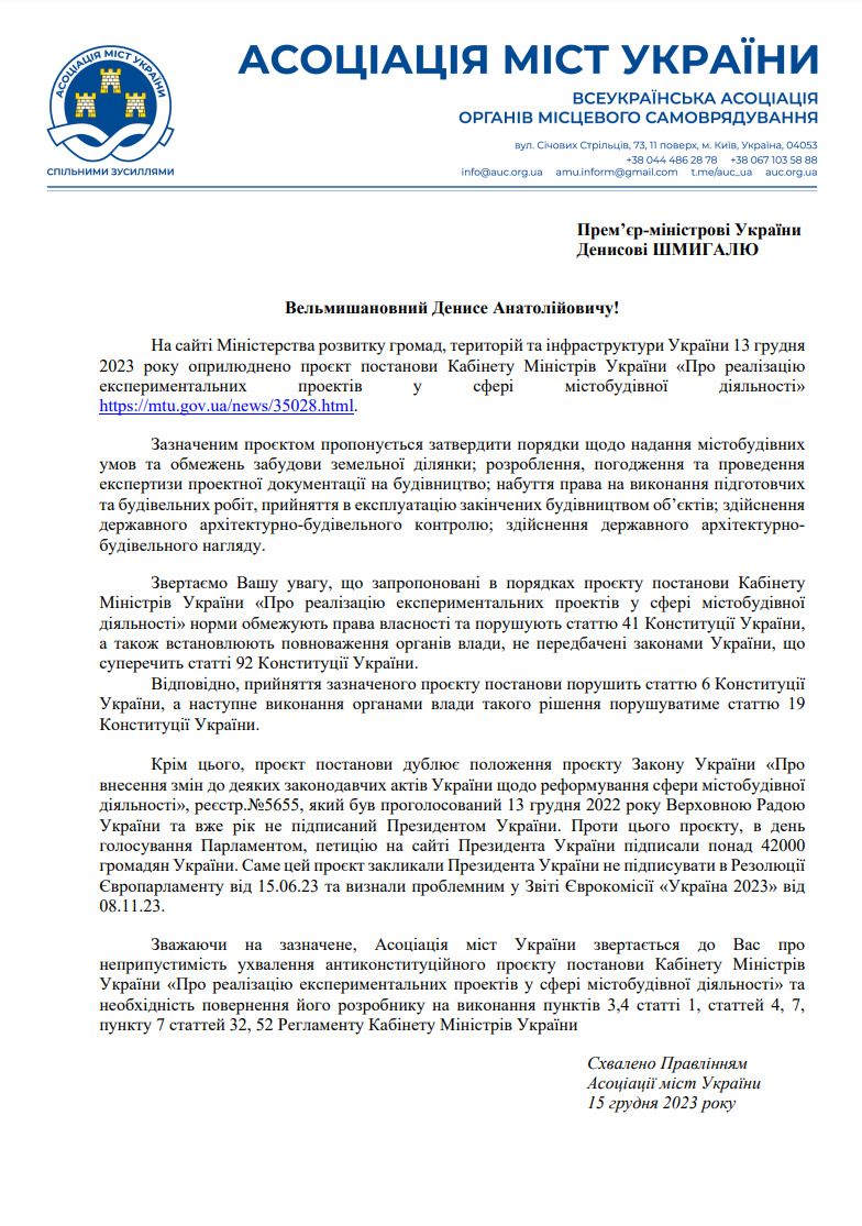 Асоціація міст України звернулася до прем’єра Денис Шмигаля із закликом повернути проєкт постанови Кабміну "Про реалізацію експериментальних проектів у сфері містобудівної діяльності" розробнику, оскільки вона порушує норми Конституції України.