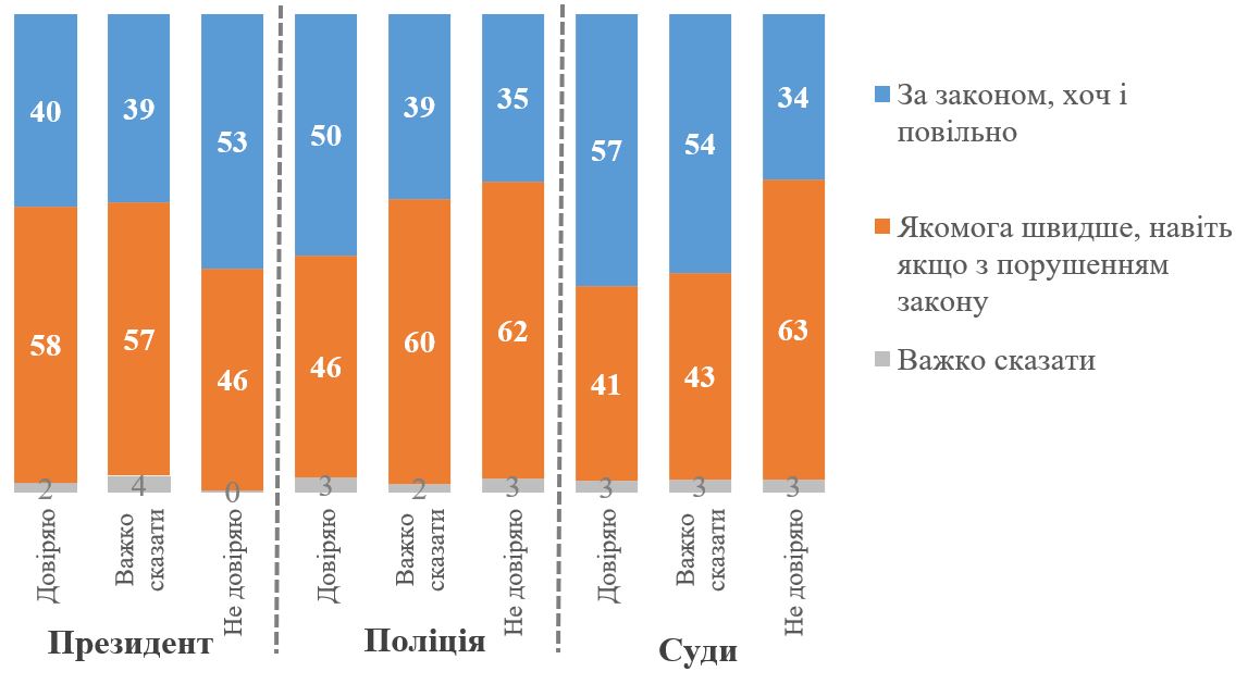 Протилежною є тенденція у випадку довіри до президента. У цьому випадку більше наполягають на якомога швидшому покаранні ті, хто довіряють Володимиру Зеленському.