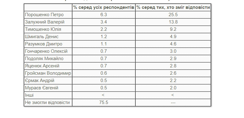 Респонденти, які змогли відповісти на запитання, назвали 71 різне прізвище. У таблиці нижче наведені основні відповіді. Відносно ж найчастіше називалися Порошенко, Залужний і Тимошенко.