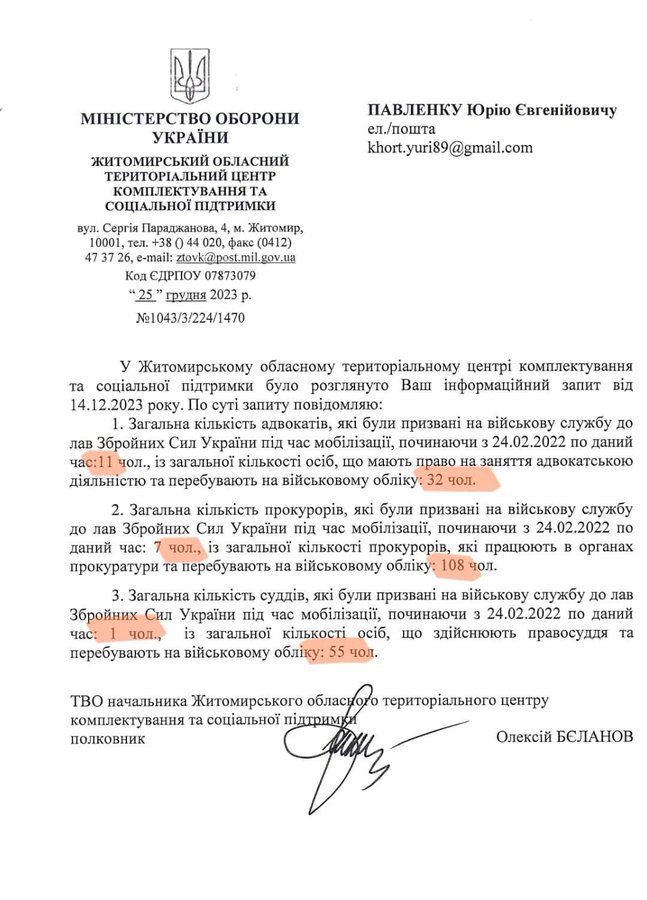 Сообщите кол-во призванных из Житомирской обл. кол-во жителей и процент работников юстиции.