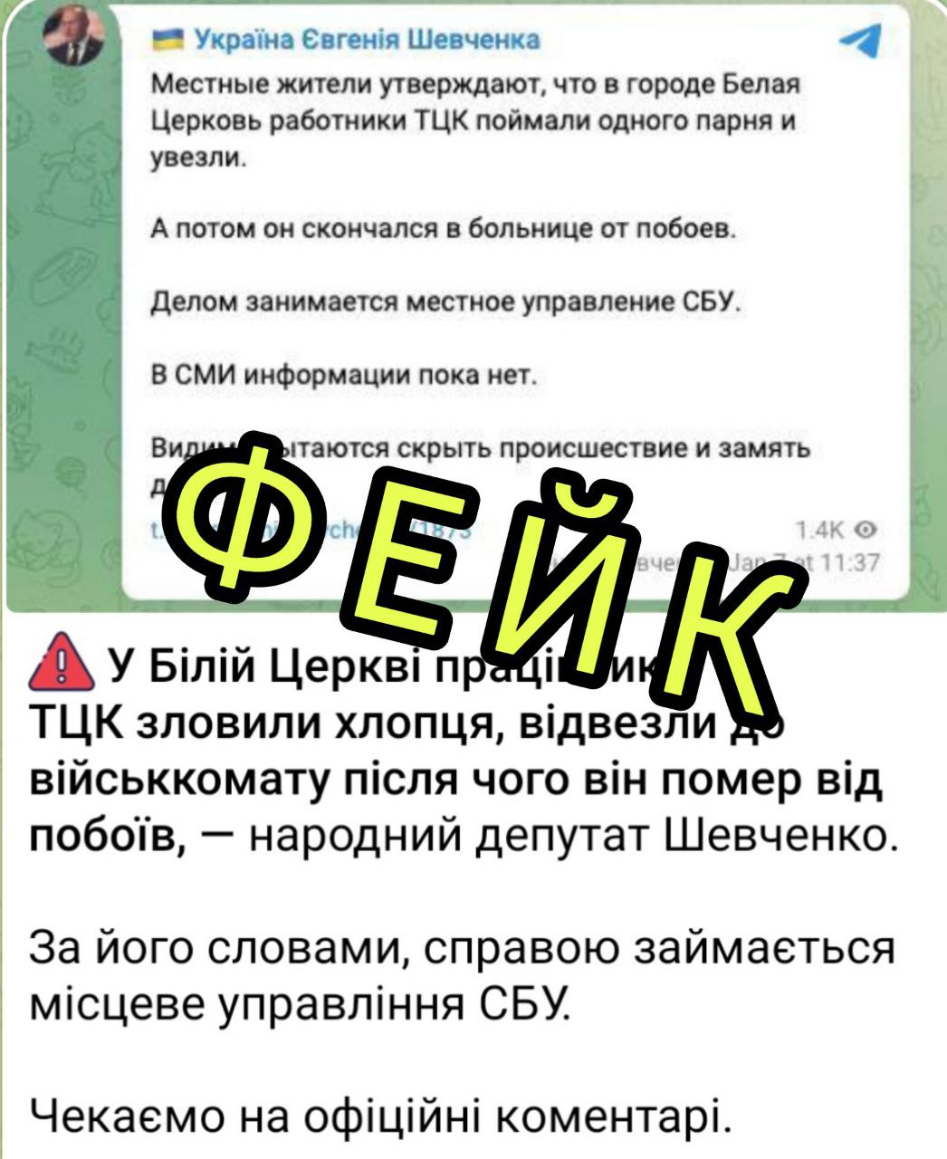Нардеп Євген Шевченко, якого виключили зі "Слуги народу", поширив у соцмережі фейк про нібито побиття чоловіка працівниками ТЦК під час вручення повістки у Білій Церкві. Народний обранець у дусі російської пропаганди, посилаючись на "місцевих жителів" стверджував, що той нібито помер від зазнаних травм.