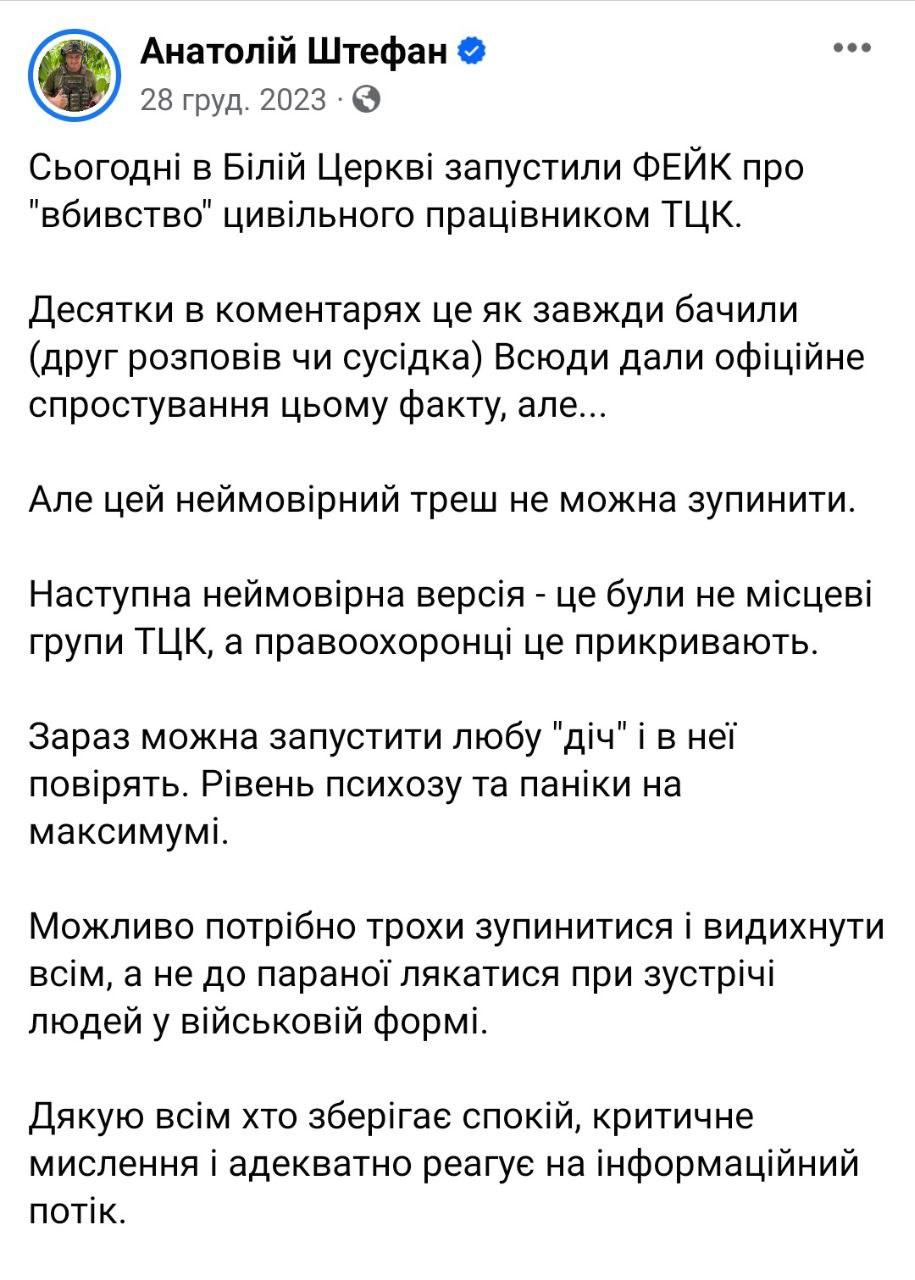 Нардеп Шевченко поширив фейк про нібито "вбивство" чоловіка працівниками ТЦК у Білій Церкві, - полковник ЗСУ Штефан